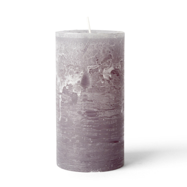 A textured gray pillar candle that creates a soothing atmosphere, suitable for both everyday use and special occasions.